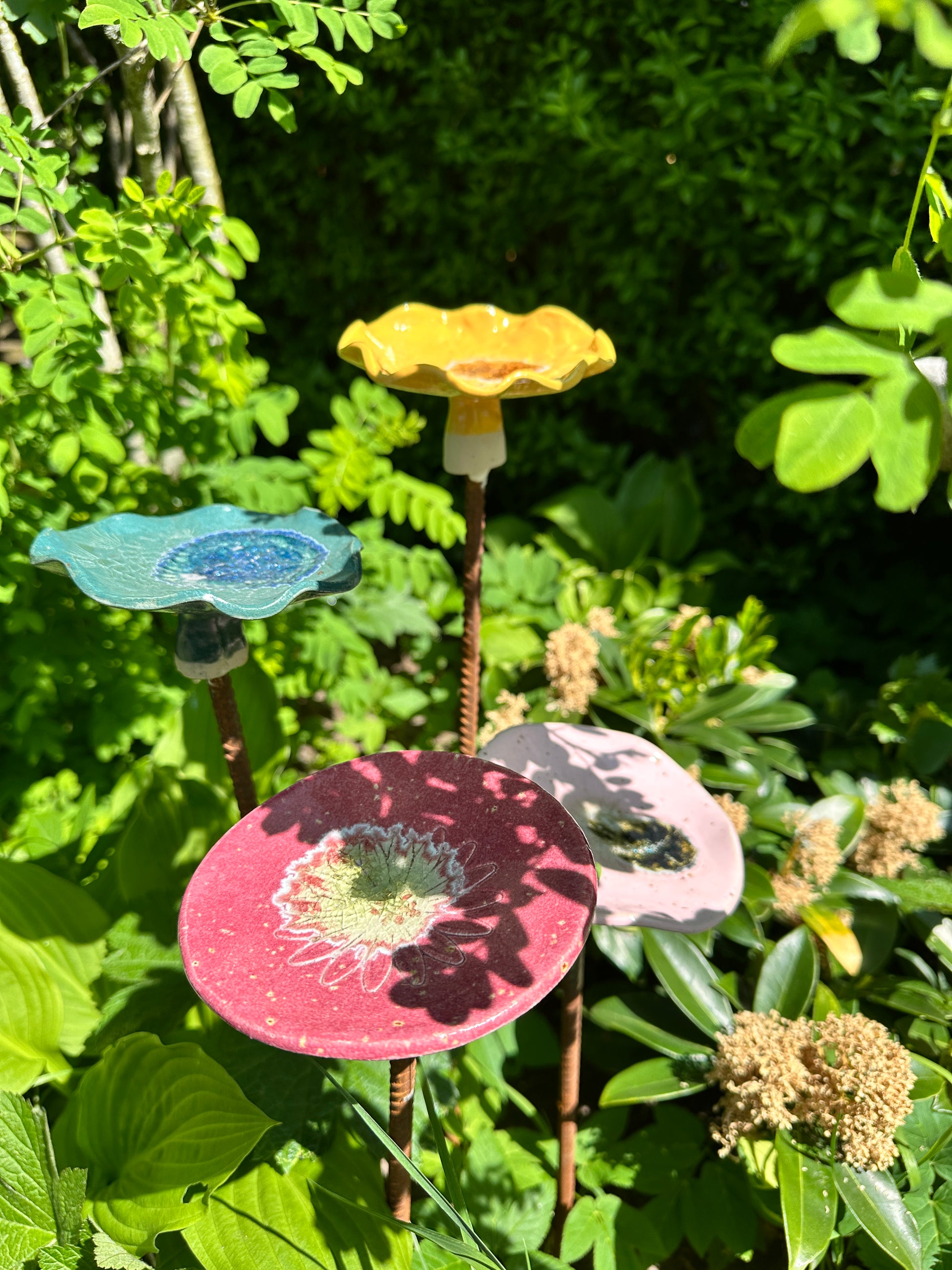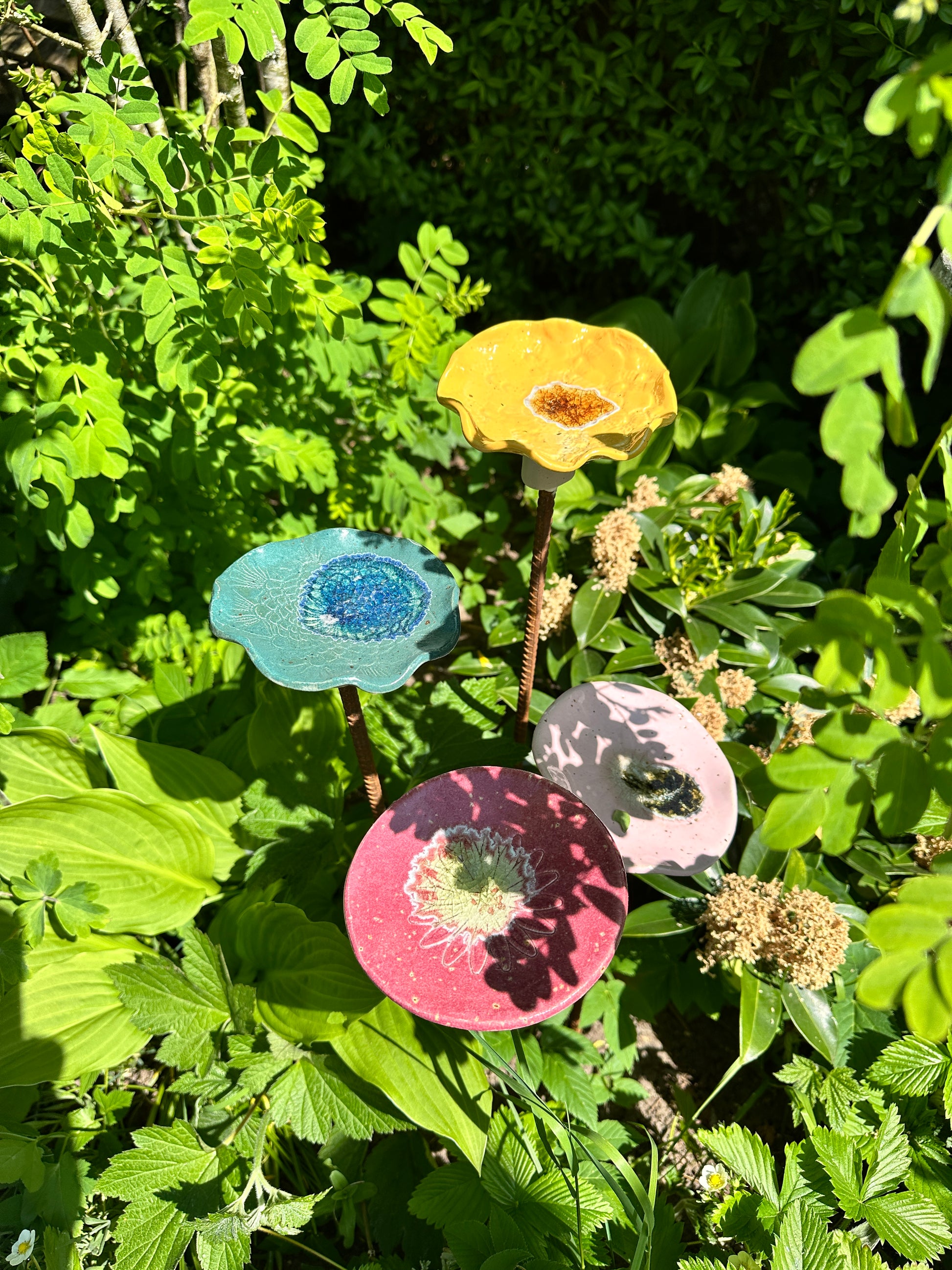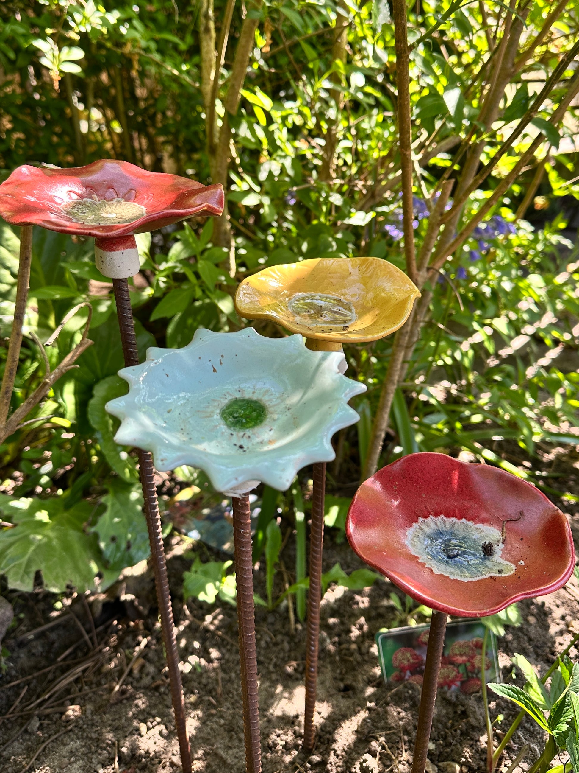 Lille keramikskål, monteres evt. på jernstang, så den er lige til at stikke i jorden.