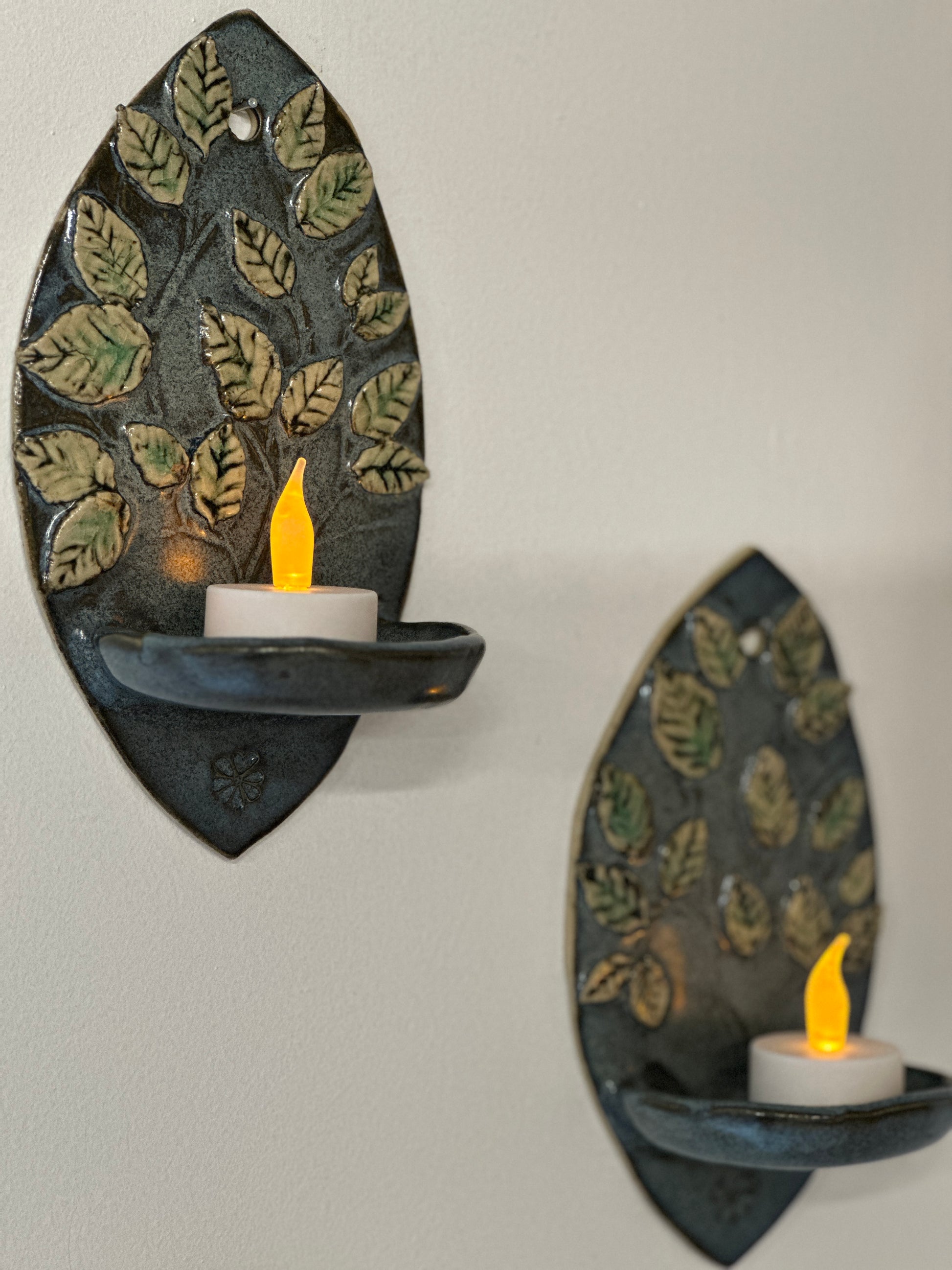 Fin vægstage med levende blå glasur og blade, der snor sig